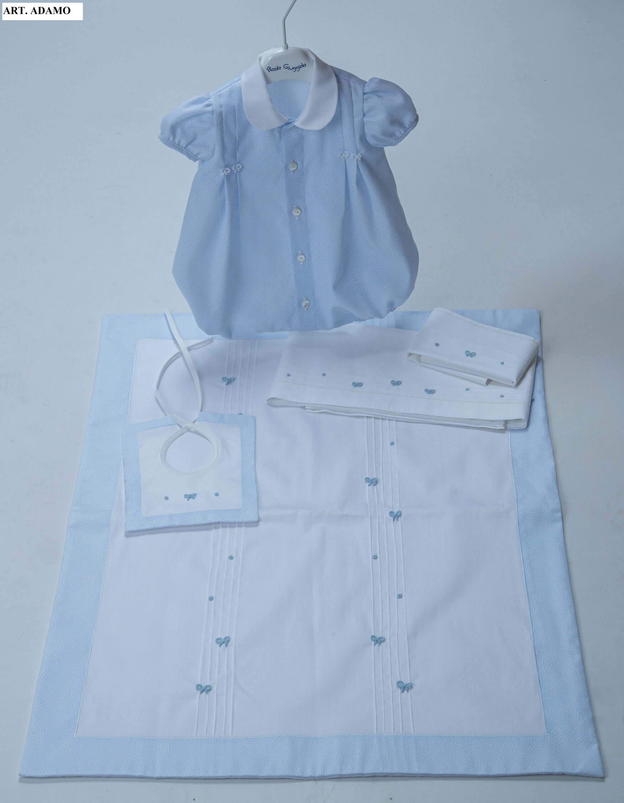 Collezione Estiva Adamo, ideato e disegnato dalla stilista Antonella Finocchiaro, produce artigianalmente abbigliamento bimbo 0-24 mesi, corredino neonato e cerimonia fino a 4 anni