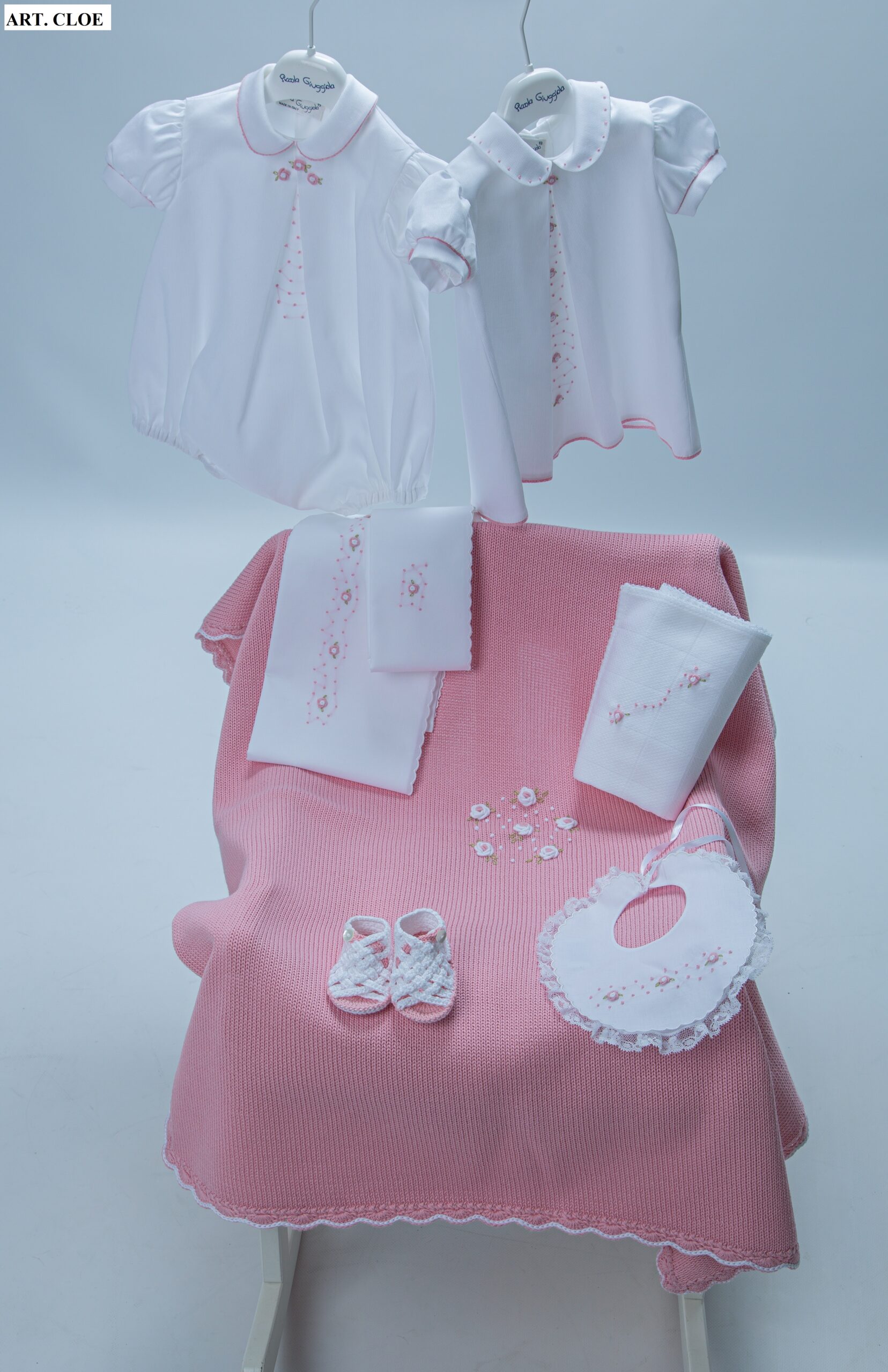 Collezione estiva Cloe, ideato e disegnato dalla stilista Antonella Finocchiaro, produce artigianalmente abbigliamento bimbo 0-24 mesi, corredino neonato e cerimonia fino a 4 anni